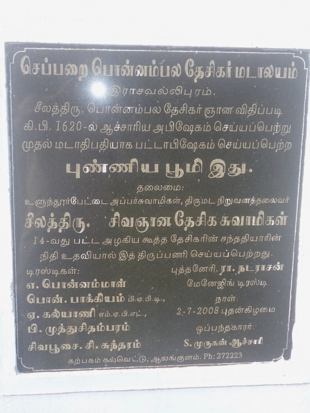 செப்பறை கோயில் அருகில் உள்ள பொன்னம்பல தேசிகர் மடாலயத்தின் கல்வெட்டு. இதில் இறுதியில், ஐயாவின் பெயர் பொறிக்கப்பட்டுள்ளது. |